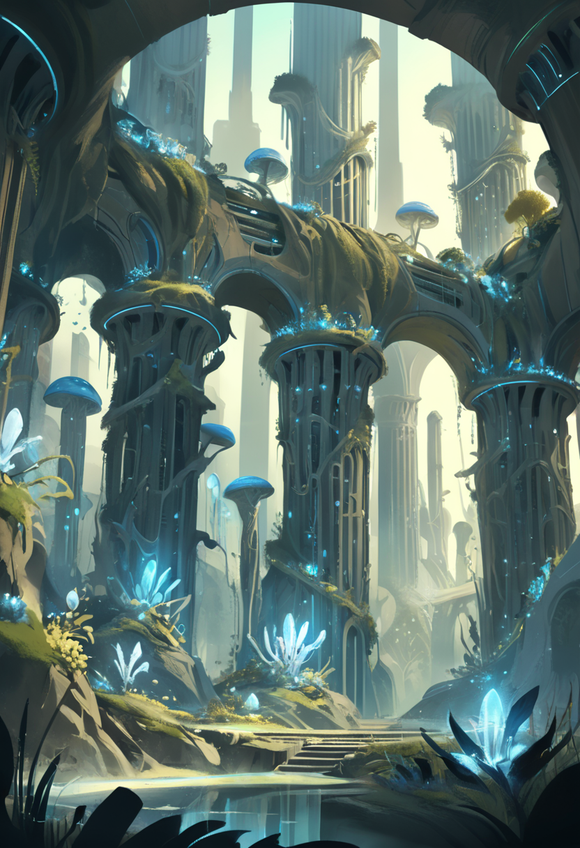 drawix13, surreal architecture, blending nature and technology, colossal pillars reaching for a luminescent sky, soft light filtering through organic materials, cool blues, earthy hues, bioluminescent flora, otherworldly
