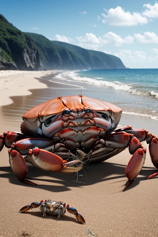 Landscape with crabs, (Crab, pink round body, Short legs:1.2), (catching fish:1.4), on beautiful beach, (masterpiece, best quality:1.4), Photorealistic, ultra-high res, 4k, 8k, insanely detailed, insanely beautiful, perfect finish,