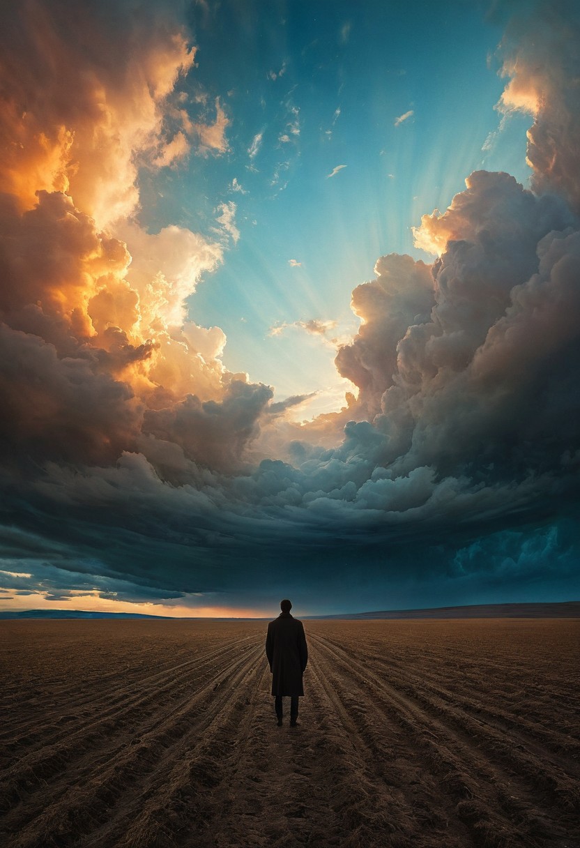 (art by Eduard Wilhelm Pose and Master of the Holy Blood and Ivan Bilibin:1.1)(oxygen-rich air and sheltered atmosphere,, aesthetic of hard - edge painting:0.1) (ingenious opus magnum by Michael Vincent Manalo and Elvira Vigna:1.2), (pastel oil painting:0.1) "Surreal Sky Fragments": Square frames are scattered across a barren field, each one capturing a different fragment of the surreal sky above. The sky is filled with swirling clouds, vivid colors, and ethereal light, reminiscent of Beksinski's abstract paintings. A silhouette figure lies within each frame, their form blending with the surreal beauty of the sky. The post-processing enhances the dreamlike quality, adding a soft focus and a subtle glow to the ethereal light, creating a sense of otherworldly peace.