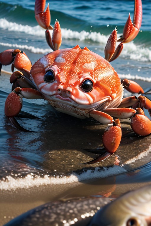 Landscape with crabs, Crab, pink round body, Short legs, (catching fish:1.4), on beautiful beach, (masterpiece, best quality:1.4), Photorealistic, ultra-high res, 4k, 8k, insanely detailed, insanely beautiful, perfect finish,