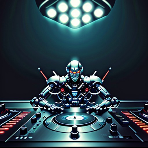 (masterpiece, best quality:1.5), detailed picture, HD32k, depth_of_field, realistic, landscape,cybernetic robot retrofuturism style dark and dimly lit underground nightclub, grunge-style android DJ, (spinning pulsating synthesizers, laying down heavy basslines, turntable scratching, composer,) dramatic lighting from stage spotlights, smoke, stage background, (style of Melvyn Grant, Henry Richard Van Dongen, Franco Brambilla), <lora:zavy-cntrst-sdxl:1.0>. android, AI, machine, metal, wires, tech, futuristic, highly detailed, white cat with cybernetic body, red eyes, robot, j_sci-fi