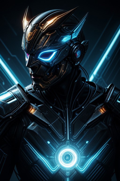 masterpiece, best quality, absurdres, illustration, photorealistic, cinematic lighting, dynamic angle, perfect composition, 1other, futuristic, oni, holographic interface, glowing circuitry, mechanical limbs, futuristic mask, digital aura, high-tech environment
