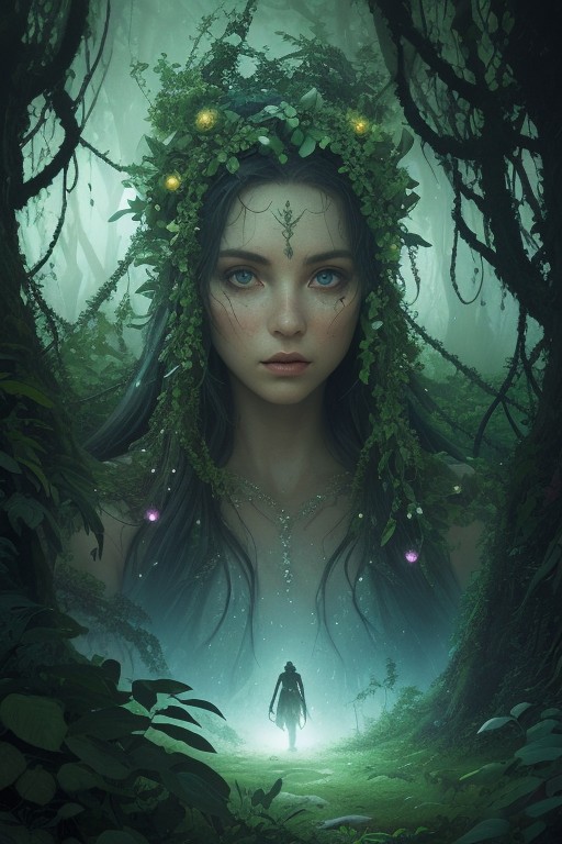 rating safe, cinematic still, filmed by Guillermo del Toro, Amidst a deep dark forest, an enigmatic being appears--an amalgamation of flora and fauna, with vines for hair, eyes gleaming like embers, and skin adorned with iridescent scales,