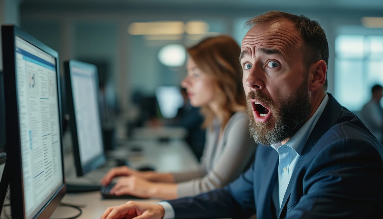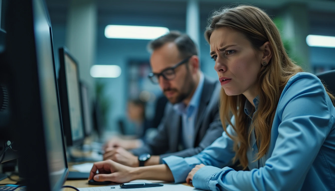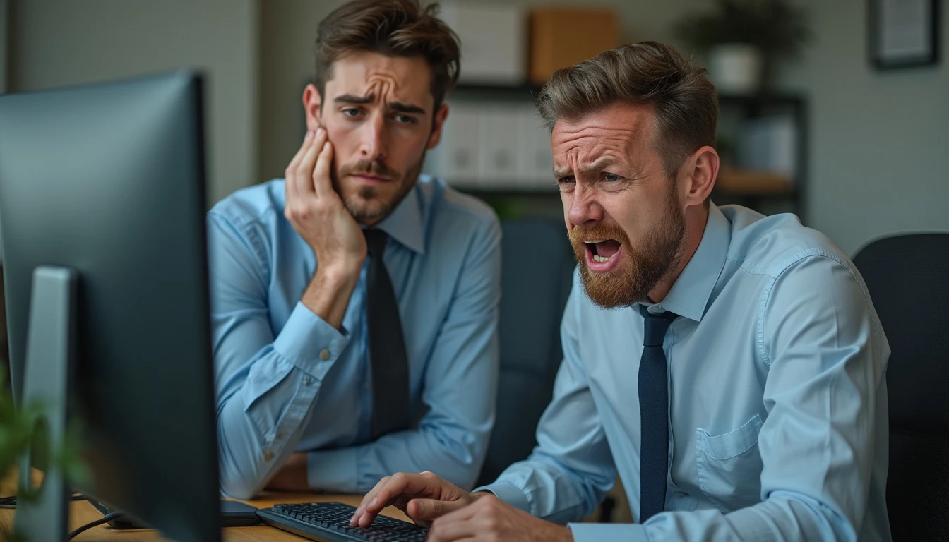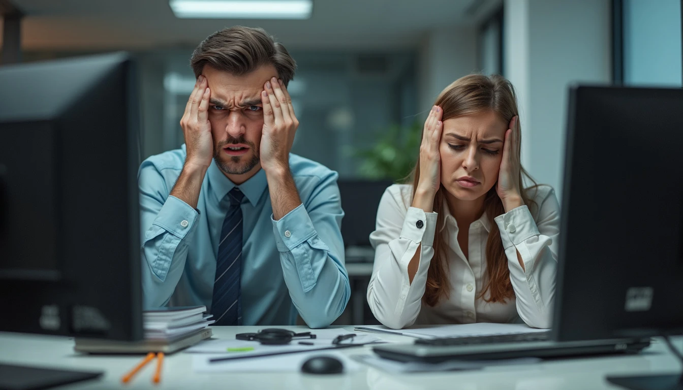 Professional photograph of two officials in an office in front of their computers, feeling very hot, with anguished faces