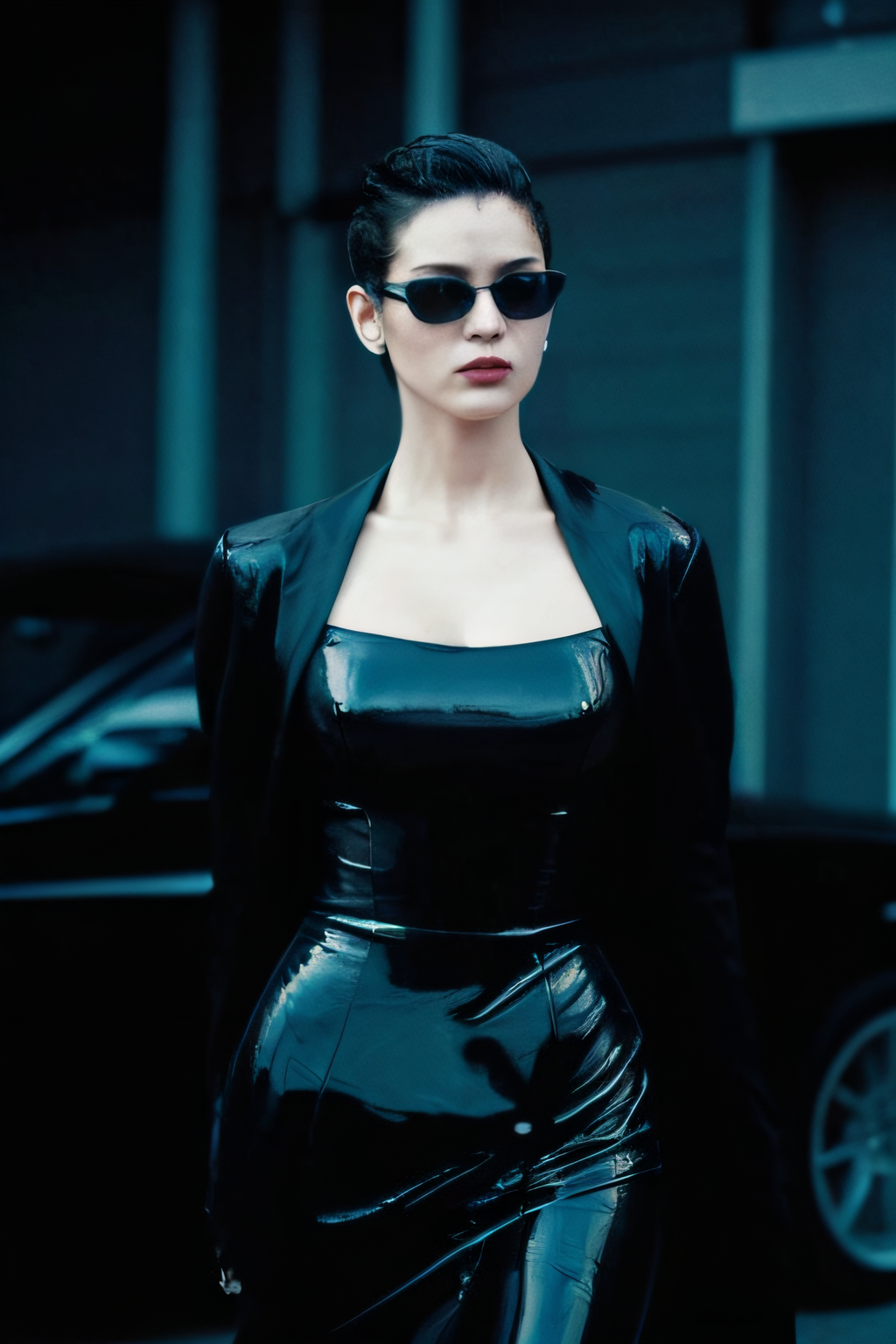 a woman in a black dress and sunglasses walking down a street with a car behind her in the background, Eve Ryder, cyberpunk, cyberpunk art, neo-figurative