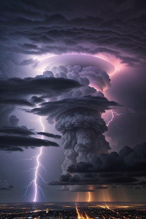 A huge tower-shaped thundercloud, the dark gray of an approaching storm. Bright lightning flashes inside and below the cloud, illuminating the cloud around it in purple. Translucent streams of rain pour down from the cloud. Below is a small town with low-rise buildings. warm colors, masterpiece, best quality, very aesthetic,