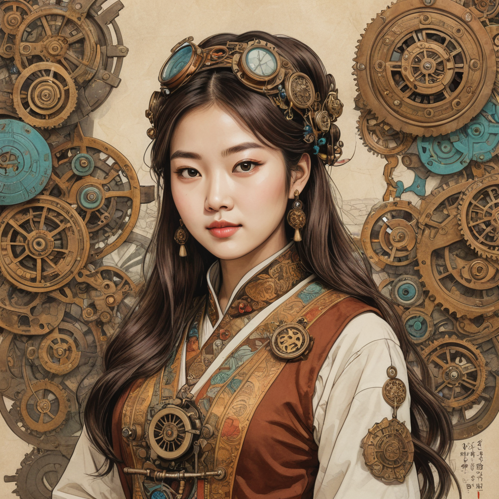 Color sketchnote image of a Korean girl. Hand-drawn elements, vibrant colors, visual hierarchy, playful illustrations, varied typography, graphic icons, organic and dynamic layout, personalized touches, creative expression, engaging storytelling., steampunk style image of a Korean girl . antique, mechanical, brass and copper tones, gears, intricate, detailed