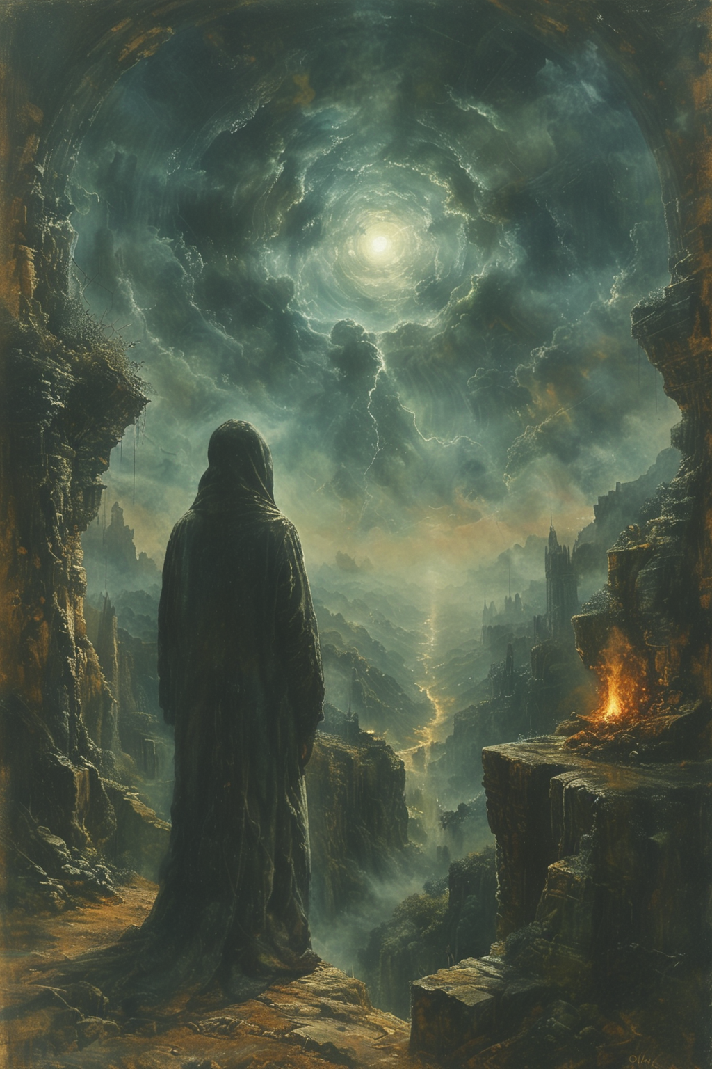 "If you gaze long into the abyss, the abyss will begin to gaze into you" (Friedrich Nietzsche) best quality, masterpiece, absurdes, (expressive:1.5), dramatic lighting, glow, eerie atmosphere, horror \(theme\), otherworldly, beyond reality, mysterious, Renaissance, impressionism, grainy, (Sepia), (Space), (Pointillism), grisaille, primary colors, contrast background, detailed, intricate, oil on canvas, dry brush, (surrealism), (disturbing), professional, excellent composition, visualy stunning, unprecedented, extraordinary, innovative, experimental, visionary, boundary-pushing, absolutely outstanding, dynamic, (double exposure), detailed background <lora:tbh233-sdxl:0.6> style of Simon Bisley <lora:tbh344-sdxl:0.5> style of Simon Schubert <lora:tbh163-sdxl:0.6> style of Mike Worrall <lora:RMSDXL_Creative:0.6> <lora:DoubleExposure:0.4> double exposure, merging, blending