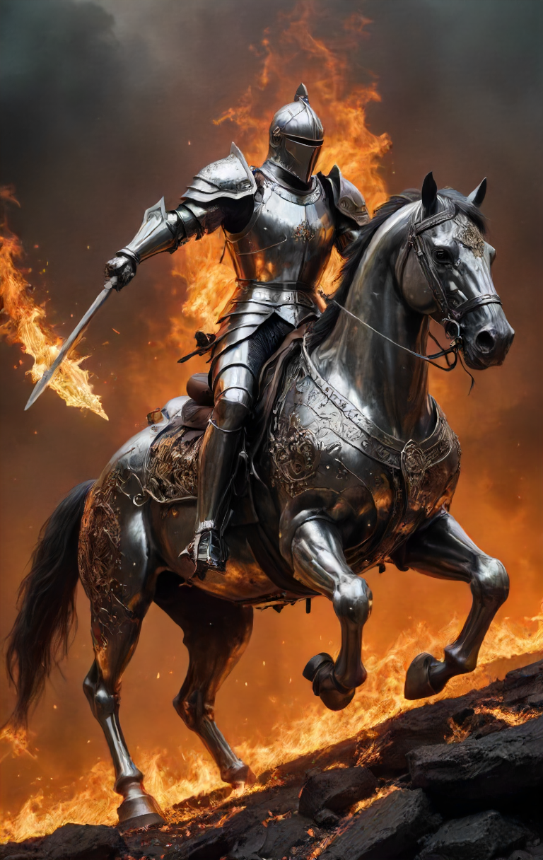 An armed steel knight riding shiny steel mechanized horse through the fiery depths of the hell,,
