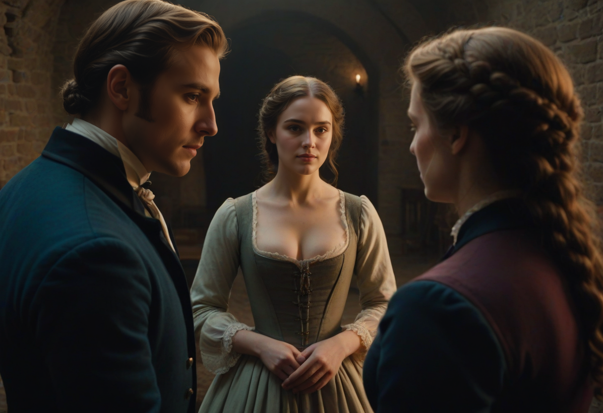 cinematic still (full-medium shot:1.1) . emotional, harmonious, vignette, highly detailed, high budget, bokeh, cinemascope, moody, epic, gorgeous, film grain, grainy, cinematic still (full-medium shot:1.1) . emotional, harmonious, vignette, 4k epic detailed, shot on kodak, 35mm photo, sharp focus, high budget, cinemascope, moody, epic, gorgeous, film grain, grainy, a girl consults with men by making eye contact, (1800s European style in bright colour tones:1.2), curvy body,(thighs:1.1), navel