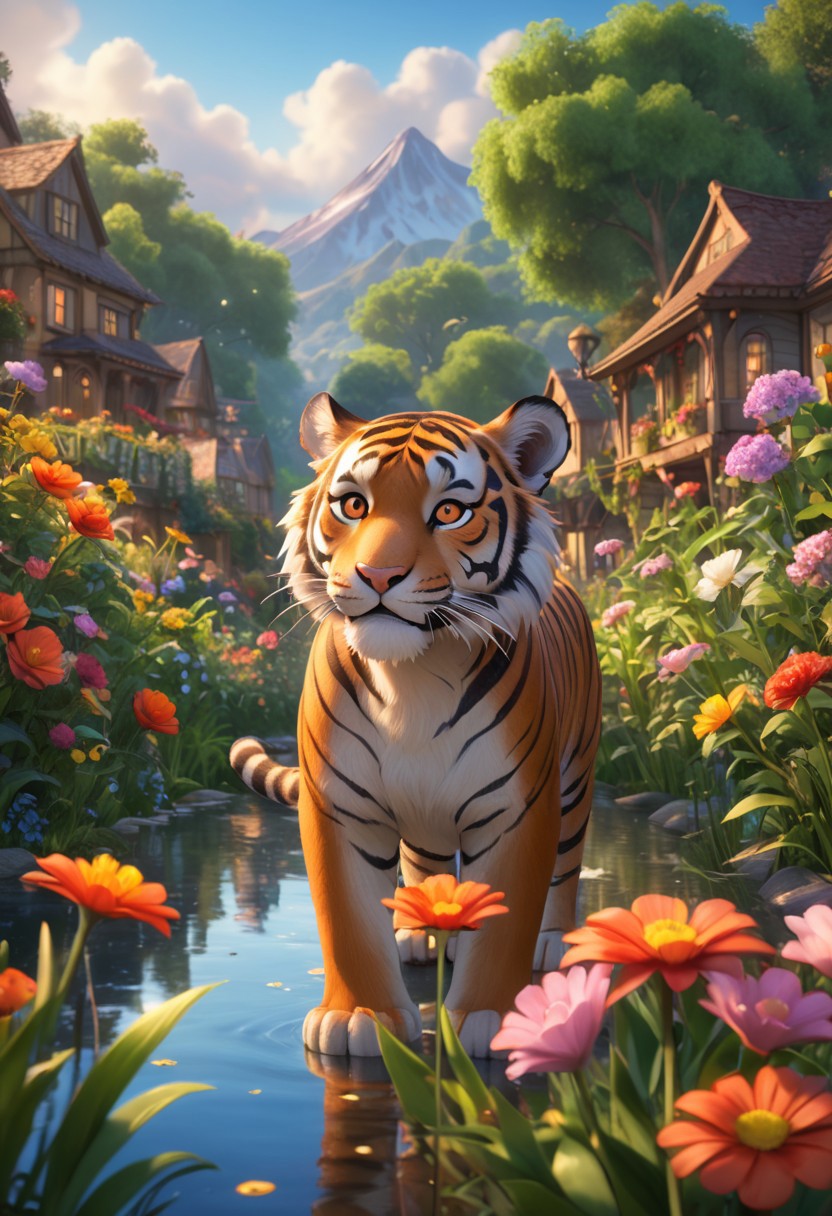 Pixar style, masterpiece, best quality, Happy tiger, highly detailed, high budget, cinemascope, moody, epic, soft natural lighting, whimsical atmosphere, ethereal glow, ultra-quality, photorealistic, candid camera, color graded cinematic, eye catchlights, atmospheric lighting, imperfections, natural, shallow dof ,sky, outdoors, flower, scenery, reflection,