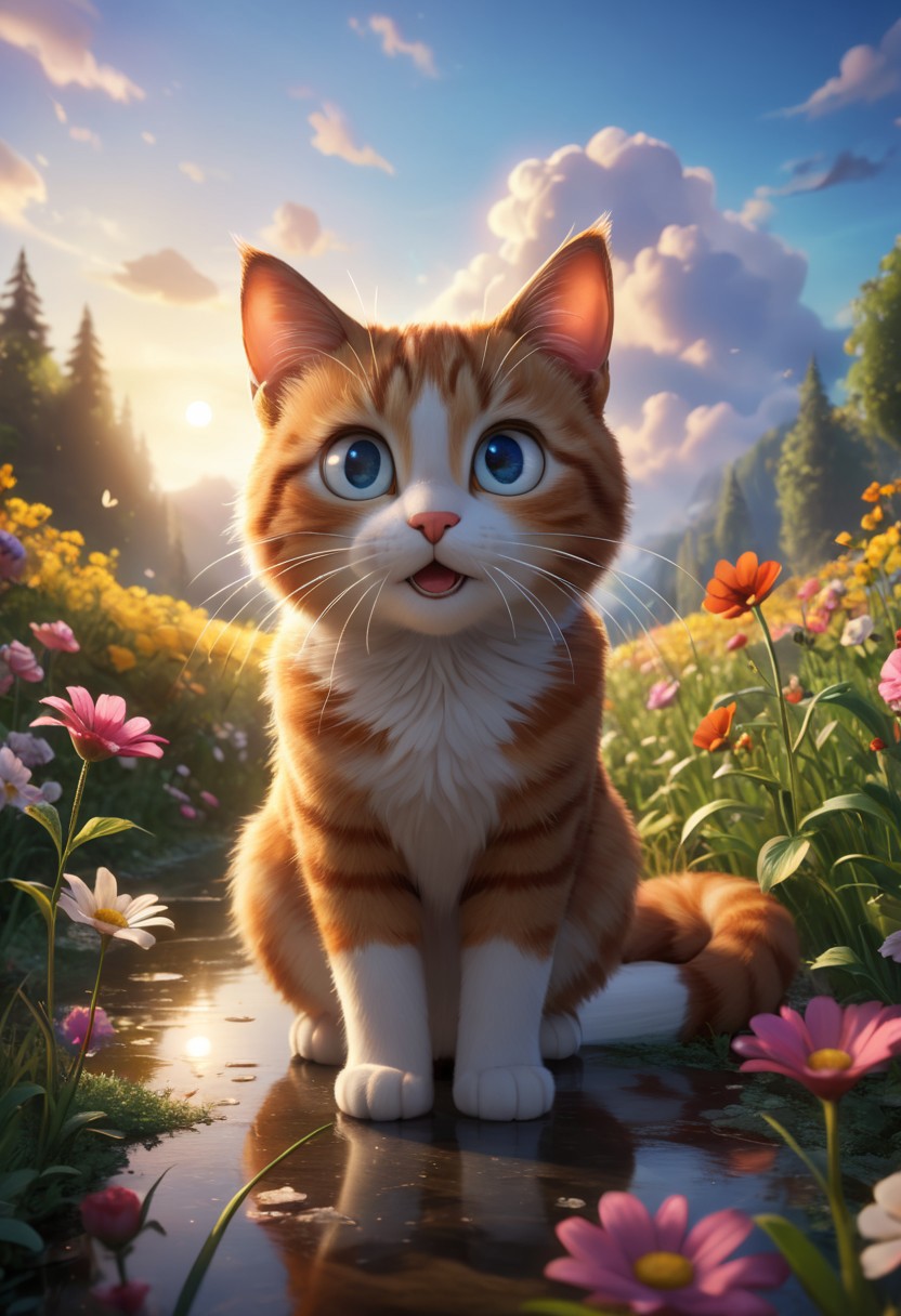 Pixar style, masterpiece, best quality, Happy Cat, highly detailed, high budget, cinemascope, moody, epic, soft natural lighting, whimsical atmosphere, ethereal glow, ultra-quality, photorealistic, candid camera, color graded cinematic, eye catchlights, atmospheric lighting, imperfections, natural, shallow dof ,sky, outdoors, flower, scenery, reflection,