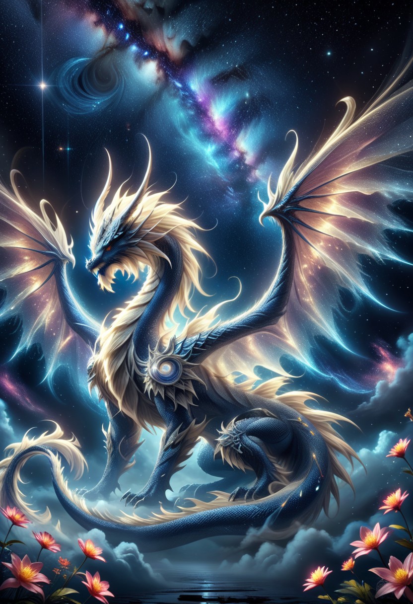 masterpiece, best quality, colossal luminous dragon. Dominating the scene is a translucent dark-blue dragon adorned with luminescent scales, blending seamlessly with its surroundings. Its wings, composed of intricately woven energy threads, shimmer in a spectrum of colors. Starry sky. Amidst the night, its presence exudes a sense of mythical power. Behind it, the swirling hues of a distant galaxy provide a mesmerizing backdrop, celestial legends. Atmospheric haze, Film grain, cinematic film still, shallow depth of field, highly detailed, high budget, cinemascope, moody, epic, OverallDetail, RAW photo, photorealistic, candid camera, color graded cinematic, eye catchlights, atmospheric lighting, imperfections, natural, shallow dof ,ral-ertmsphr,no humans, sky, outdoors, flower, star (sky), scenery, night, reflection,lightlora,made from light,light,light particles,glowing