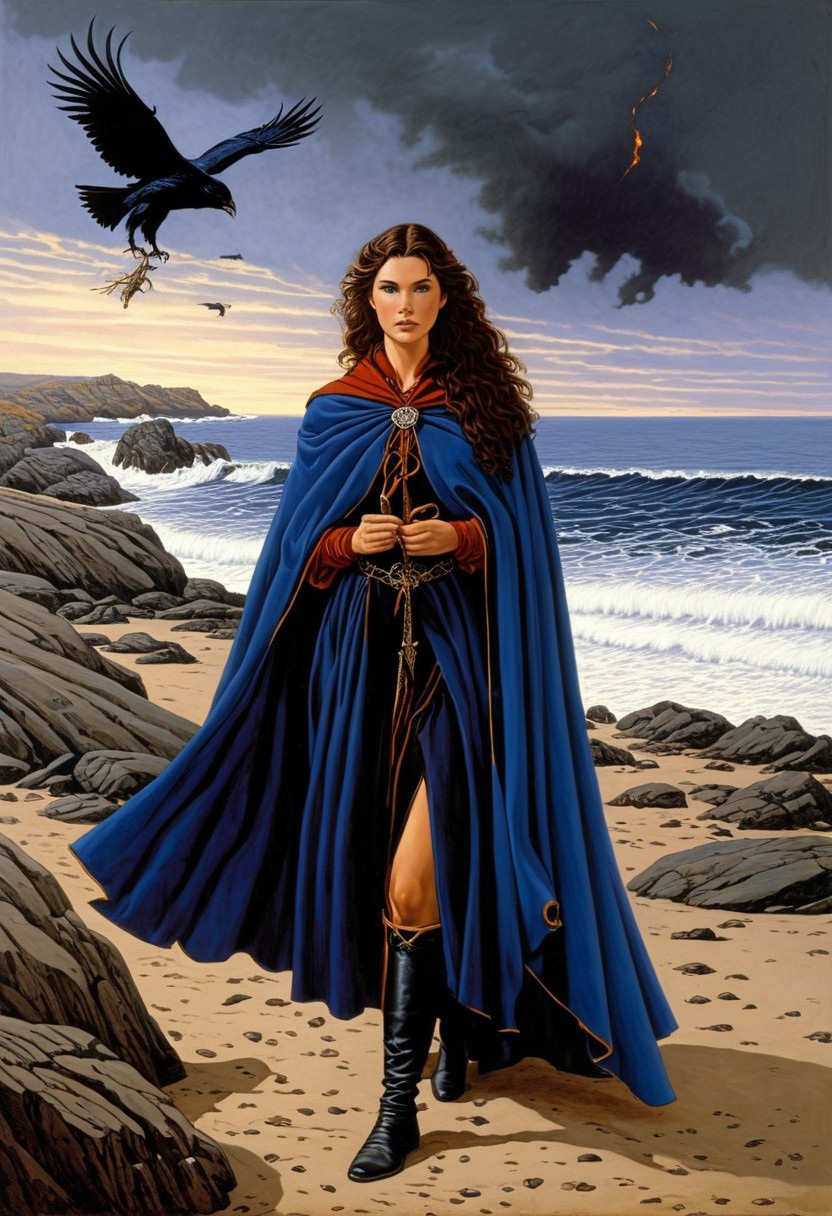 (Digital Oil Painting by Larry Elmore:2) a painting of a woman wizard wearing a large blue cloak with a crow on her shoulder sounded by a flock of ravens, dramatic fantasy art, (Michael Whelan), (John Howe), celtic fantasy art, dragonlance illustration, druid goddess, heroic dark fantasy art, (by Terese Nielsen), by Larry Elmore, 1980s fantasy art, 80's fantasy art BREAK portrait of a hot beautiful woman standing on a rocky beach near a ritual fire. There are large runes on the rocks. She is wearing a a dark blue cloak and a buckskin dress, has a serious mysterious quality. (sexy female wizard) crows flying overhead, Painting by Rebecca Guay, Arthur Rackham, Minjae Lee,