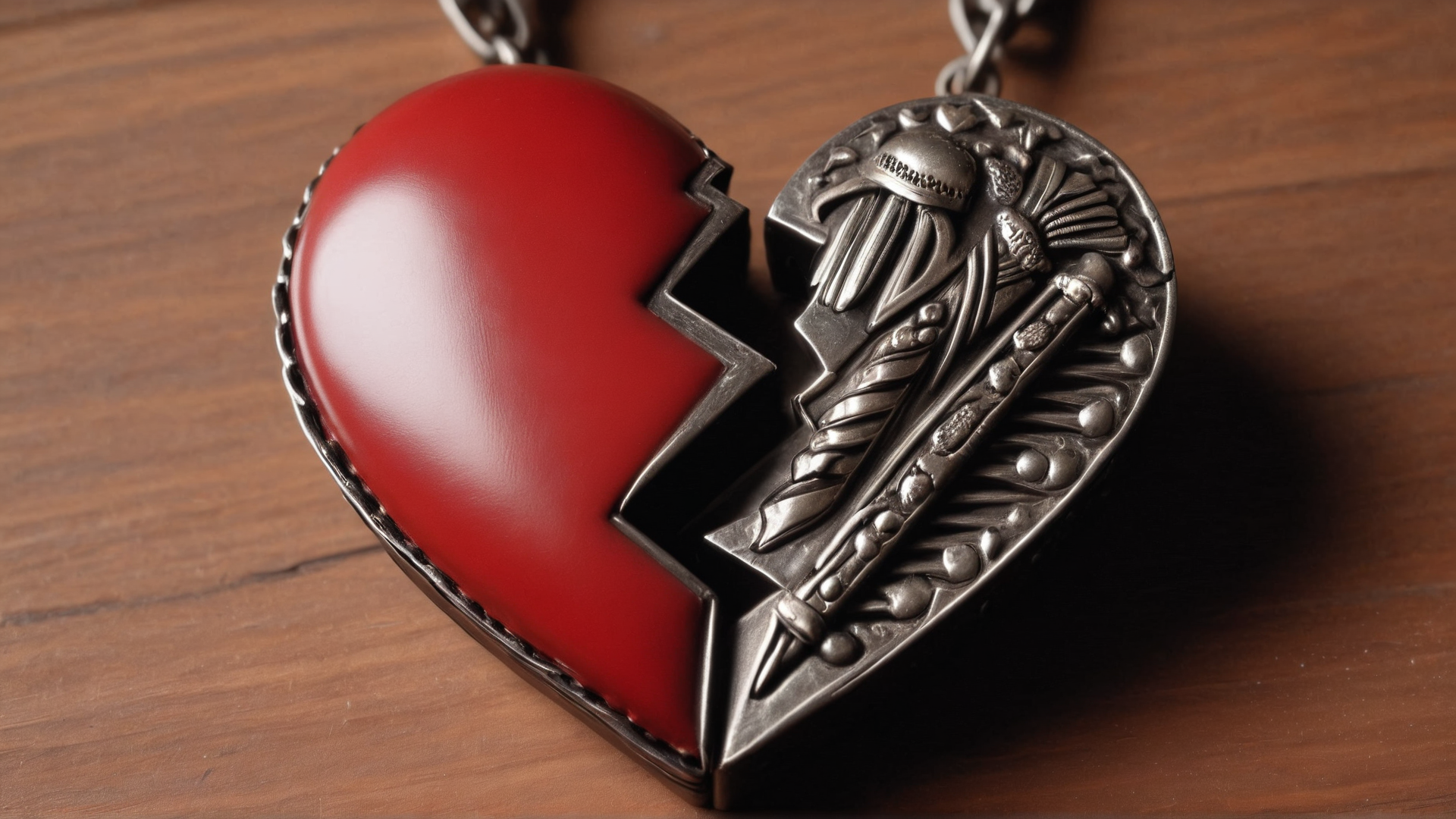 <lora:SplitHeartSDXL:1>SplitHeart, Leather heart, (Ribbon:1.2)|(accordion:1.2), Wrought iron chain, wooden background