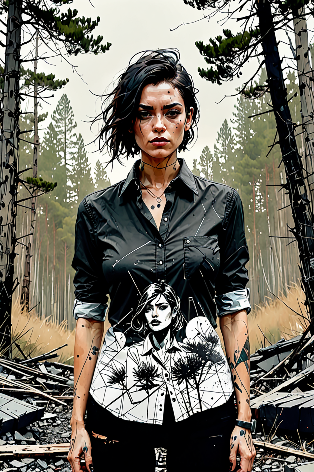 score_9,score_8_up,score_7_up,aesthetic,painterly style,modern ink,(hefty:1.3),[black:italian] woman,collared shirt,expressive pose,Lunarpunk,(Nature Scenes multilayer background:0.7),neo-expressionist,Russ Mills,Ian Miller,smug,wide shot,camera height: high,triangle-shaped face,asymmetrical face,lots of negative space,rule of thirds,