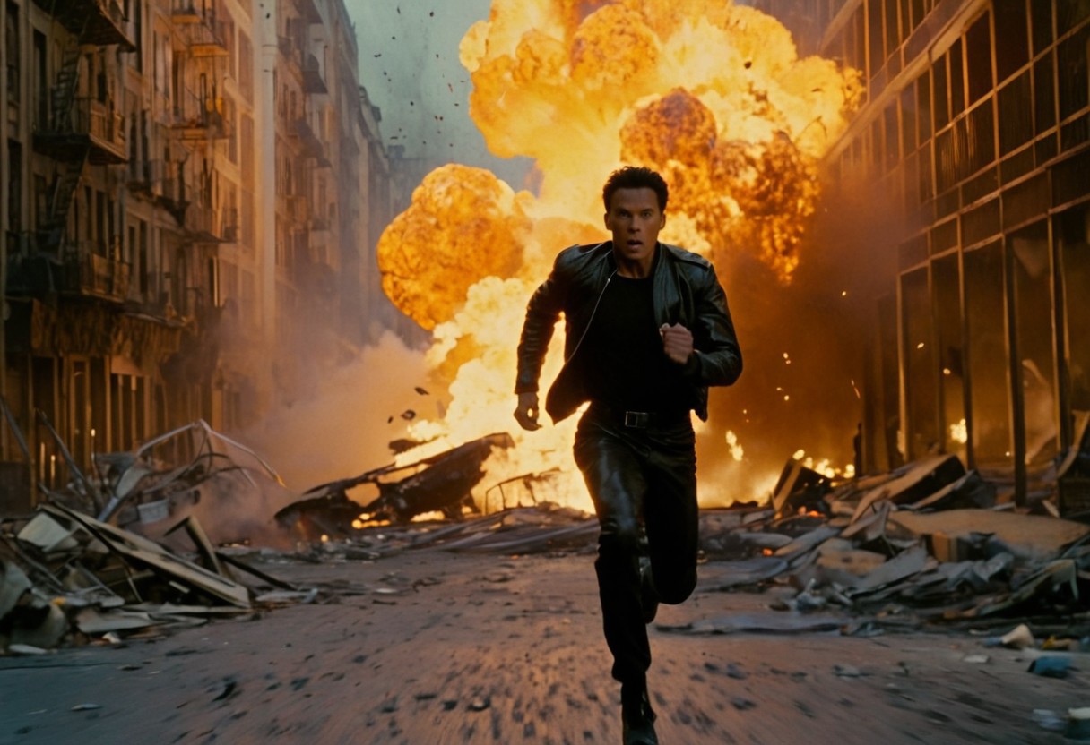Action-packed cinematic scene featuring a man with a determined expression running towards the camera. He has short dark hair, a medium skin tone, a black leather jacket, and dark pants. Behind him, a massive explosion engulfs the background, with flames and debris flying in all directions. The setting appears to be an urban street with tall buildings on either side. A silver sports car is visible on the right side of the image, partially obscured by the explosion. The overall color palette is dominated by fiery oranges and dark shadows, creating a dramatic and intense atmosphere.