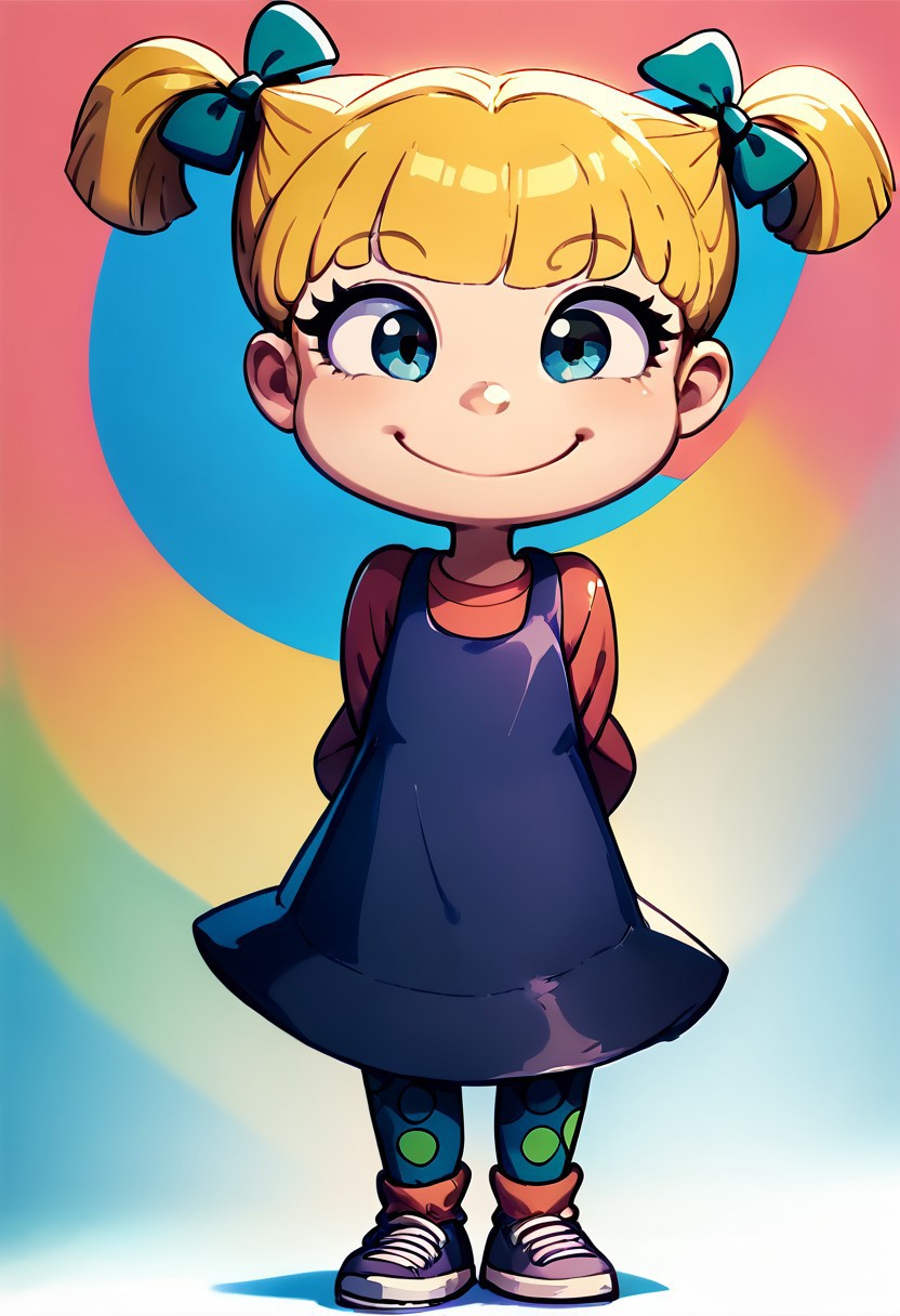 score_9, score_8, score_7, cute, colorful background, closed mouth, smile, full body, Dutch angle, solo, 1girl. blonde hair, twintails, dress, hair bow, polka dot leggings, hands behind back,