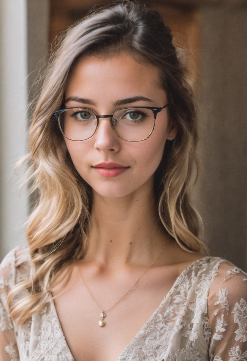 20 year old, European, woman, b cup breasts, 100 lbs, curdled hair, brown hair with blonde highlights, slight frekels, nerdy, sexy, revealing dress
