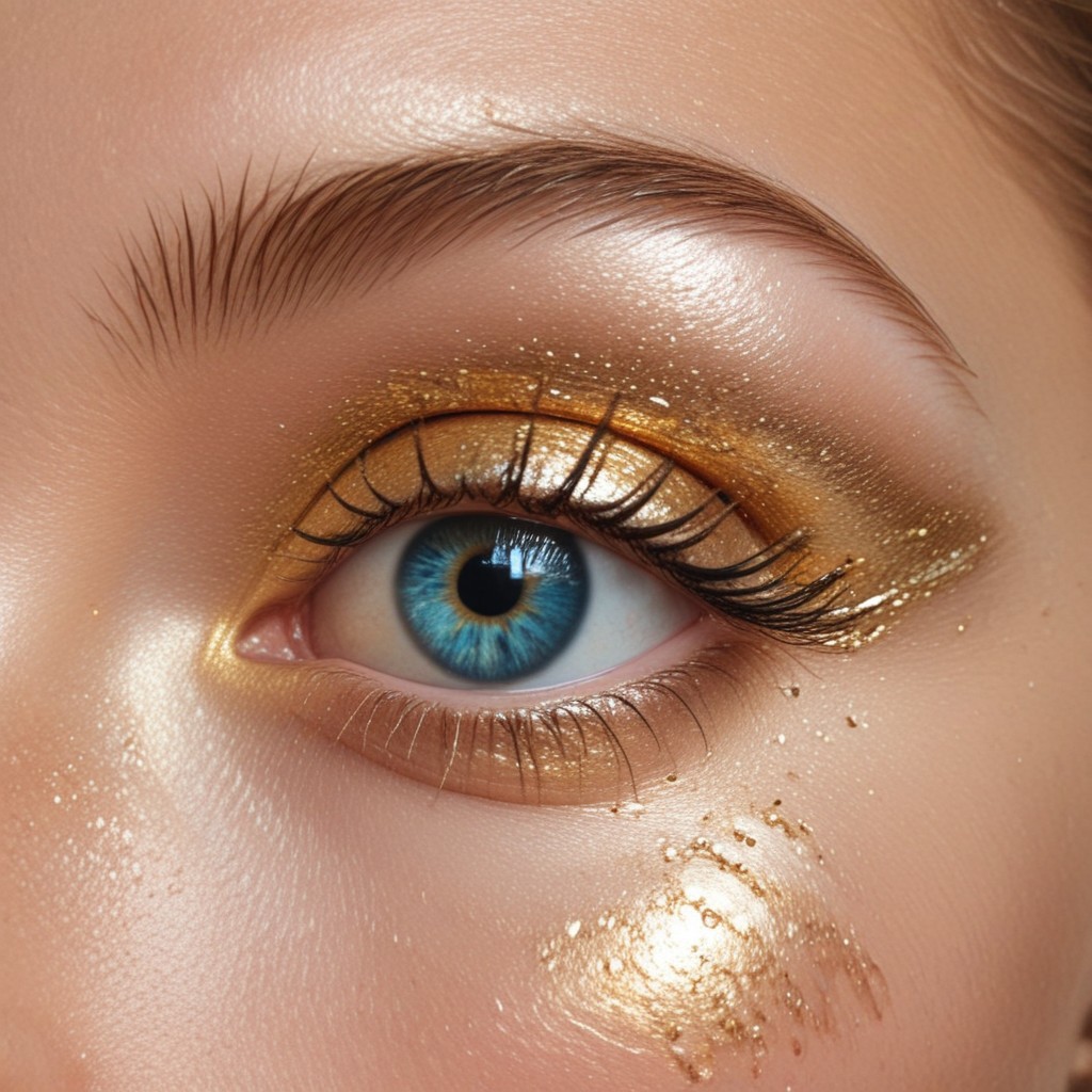 surreal art, Golden radiance, Shimmering, evil eye, eyecandy, eye catcher, portrait design, golden eye shadow, gold digger, conetemporary art, ai fashion, fashion blogger, close-up, pop art, minimalism, eyeball art work, ishtar byron bay, midjourney v6, ai art ai generated art, golden details blue eye, oh no, eye art work, jewelry, jewellery , melanin poppin, melanin queen, melanin, melanin magic, melanin makeup, beautiful lady, glamour, beautiful women, woman portrait, shine bright