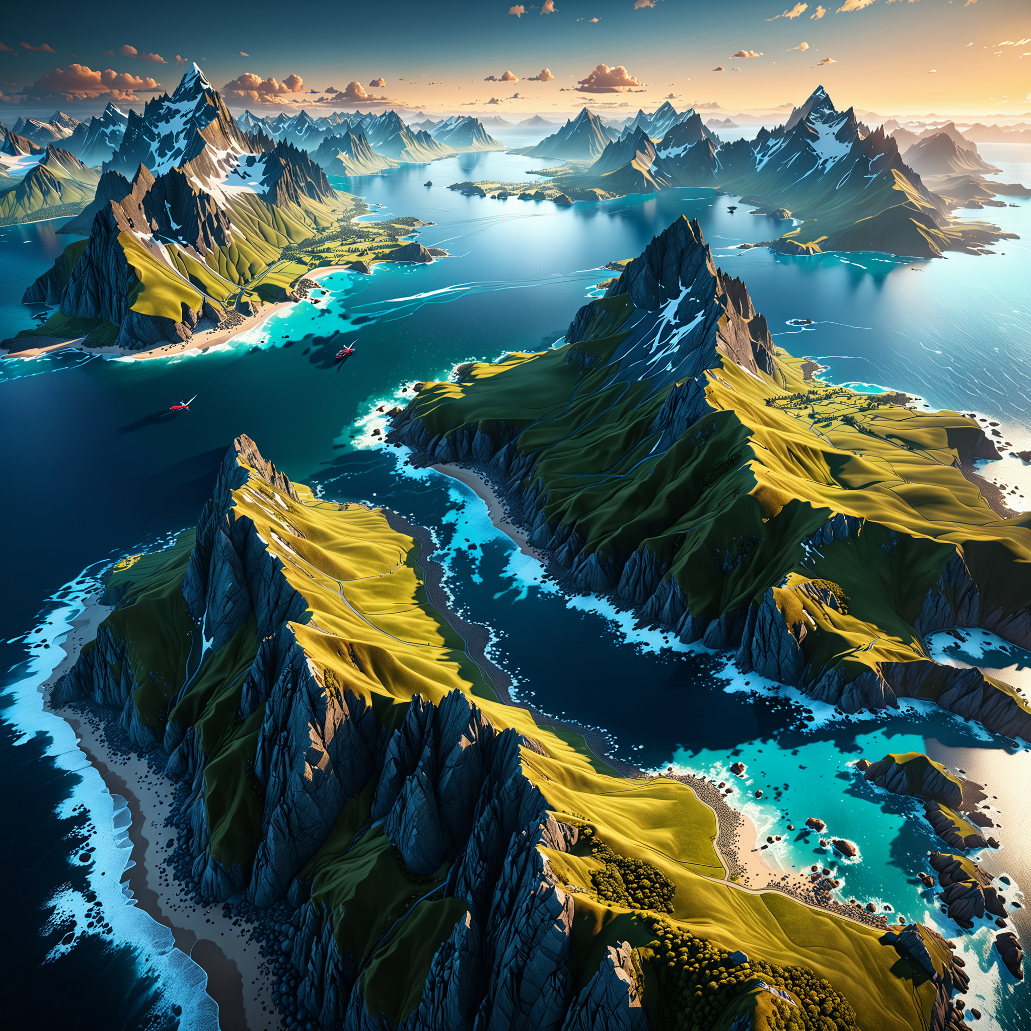 nature landscape, aerial view, drone photography, cinematic, mountains and ocean, cinematic view, epic sky, detailed, concept art, high detail, warm lighting, volumetric, godrays, vivid, beautiful, trending on artstation, by jordan grimmer, art greg rutkowski