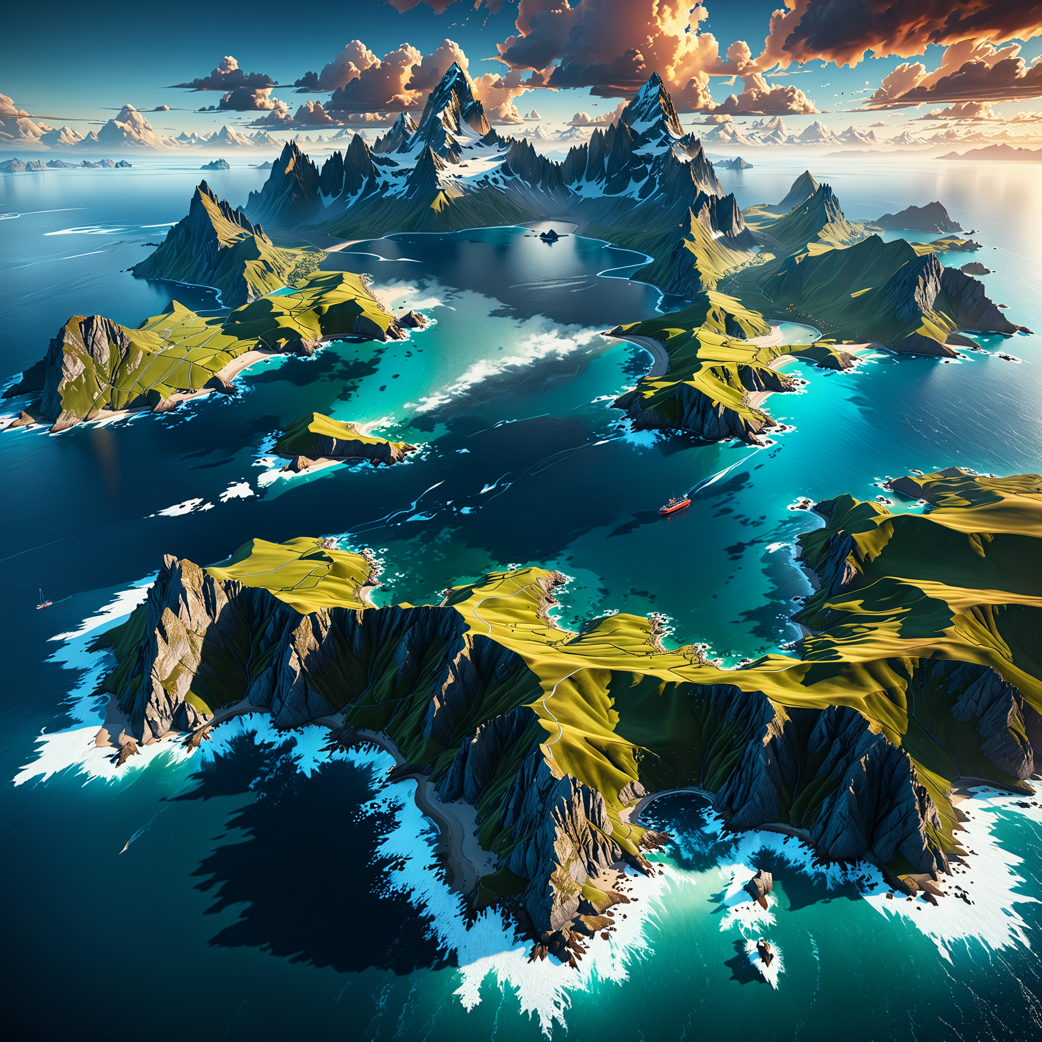 nature landscape, aerial view, drone photography, cinematic, mountains and ocean, cinematic view, epic sky, detailed, concept art, high detail, warm lighting, volumetric, godrays, vivid, beautiful, trending on artstation, by jordan grimmer, art greg rutkowski