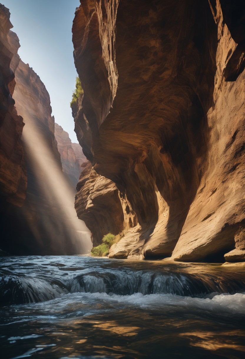 realistic photograph, (stunning:1.1), (beautiful:1.1), interesting canyon landscape. the rock consists of different colored layers. The surface of the brown and blue river sparkles in the sun light. ((camera view from the ground of the canyon slightly upwards, nearly horizontal)). (realistic colors:1.6), vibrant, detailed, natural, (accurate lighting:1.3), (true-to-life:1.4), (photorealistic:1.5), (clear:1.2), (sharp:1.2), Nikon D850, DSLR, (film stock:1.1), realistic, nature. morning light.