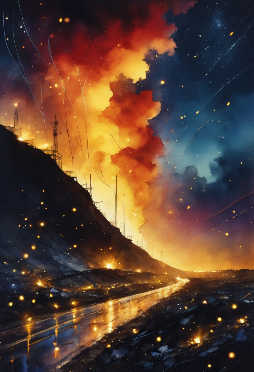 mix of watercolor and oil painting, realistic, photo, photorealistic, etheral, motion lines, glowing, Chiaroscuro, hazardous landfill background, at Midnight hour, summer, Heatwave Weather, deep colors, vivid, colorful, fairy tale aethestics, magic, fireflies, cinematic composition, volumetric lighting, side view, penumbra, Dazzling sky backdrop, celestial, ethereal, (masterpiece, best quality), ultra detailed, highly detailed, insanely detailed