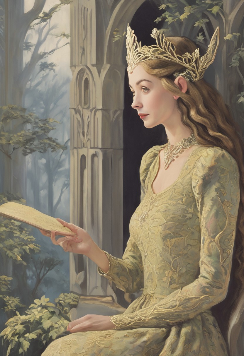 detailxl, easynegative, style of Dorothy Draper, The Lord of the Rings style, BREAK, (((solo))), ((1female)), (((/galadriel/))), (((elf))), (((long hair))), (((tiara))), (((blonde hair))), long green robe, long white dress, BREAK, forest