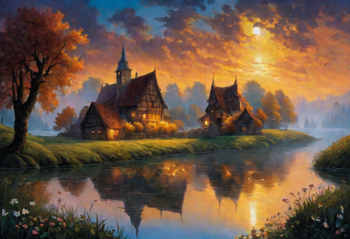 score_9, score_8_up, score_7_up, score_6_up, score_5_up, score_4_up, masterpiece, highres, highly detailed, oil painting, precice brushstrokes, cinematic lighting, lake, autumn, forest, moon rising, sky, a medieval village by the lake, evening, nature, river, clouds, flowers, dark fantasy page, fog, ducks in the pond