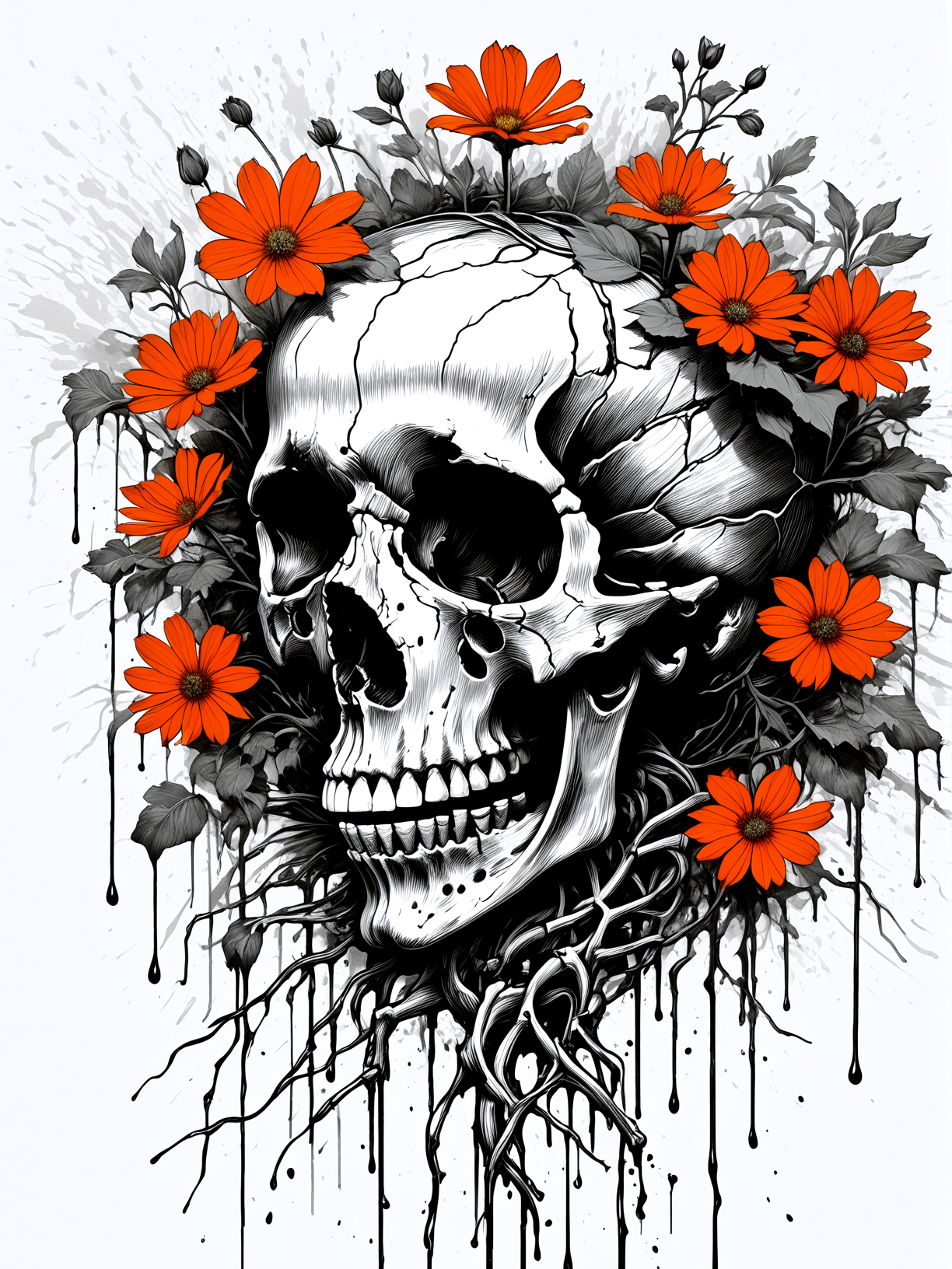 roots,flower,skeleton,white background,line art,clenched teeth,close-up, dripping ink, <lora:[GP] somethingweird [Pony XL]:1>, <lora:Splash_Art_SDXL:0.7>,