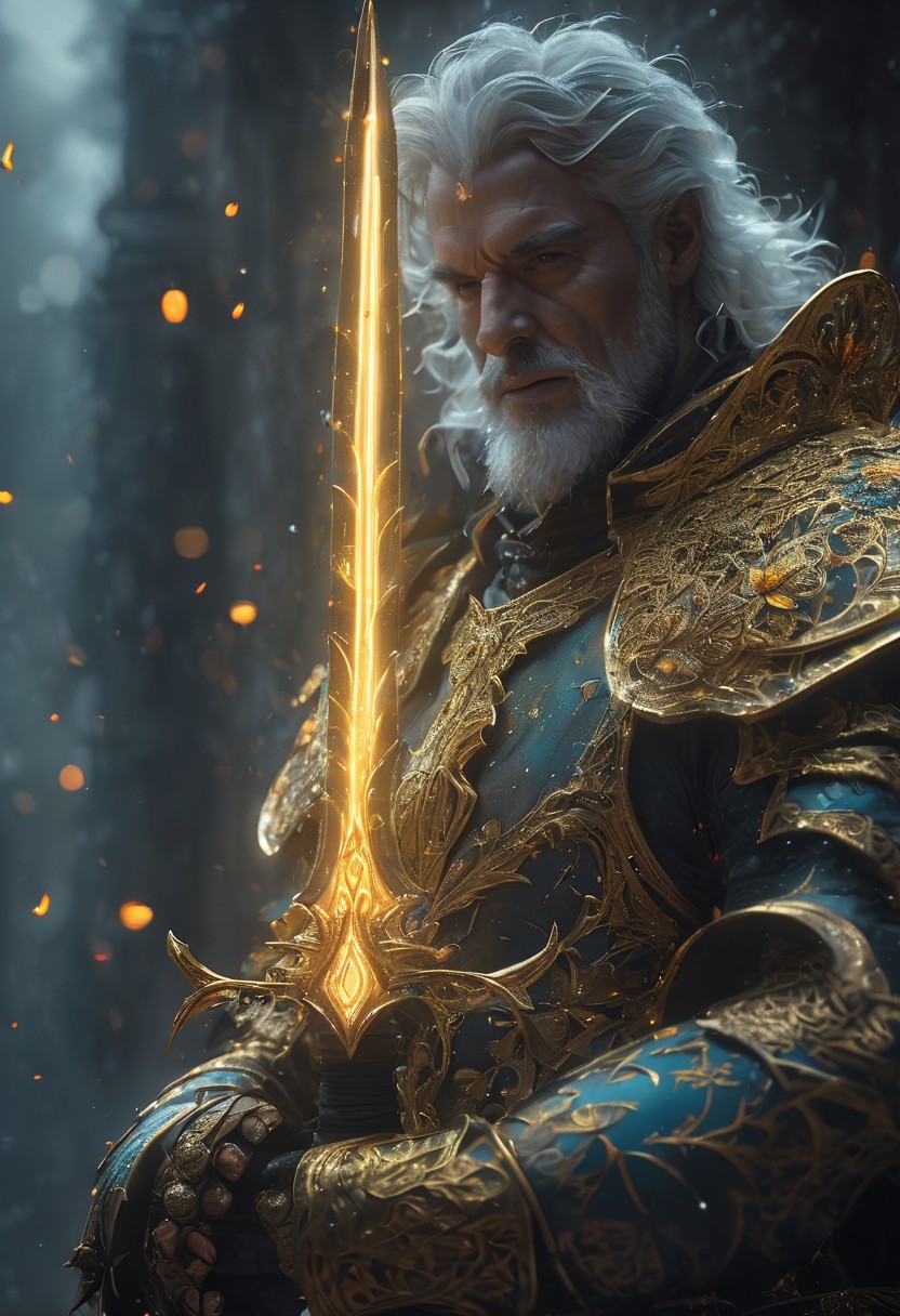 Cinematic shot medieval fantasy bard holding a magical kaleidoscopic glowing rapier by hand, (hilt resembles butterfly wings),raining reflective light, HKStyle, HD, masterpiece, best quality, hyper detailed, ultra detailed, super realistic