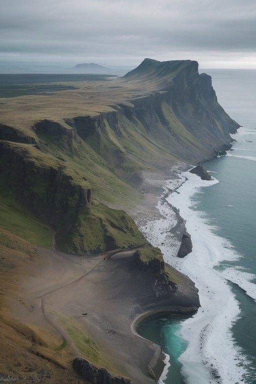 Create a tilted-shift highly realistic and dramatic scene featuring beautiful cliffs of Iceland by the Ocean The lighting should be breathtaking, with clear and captivating highlights and shadows, adding depth and dimension to the scene. The overall image should be vivid, detailed, and magical, capturing the serene beauty of this idyllic landscape <lora:eye_catching:0.5> <lora:extremely_detailed:0.4> <lora:MJ52:0.4>