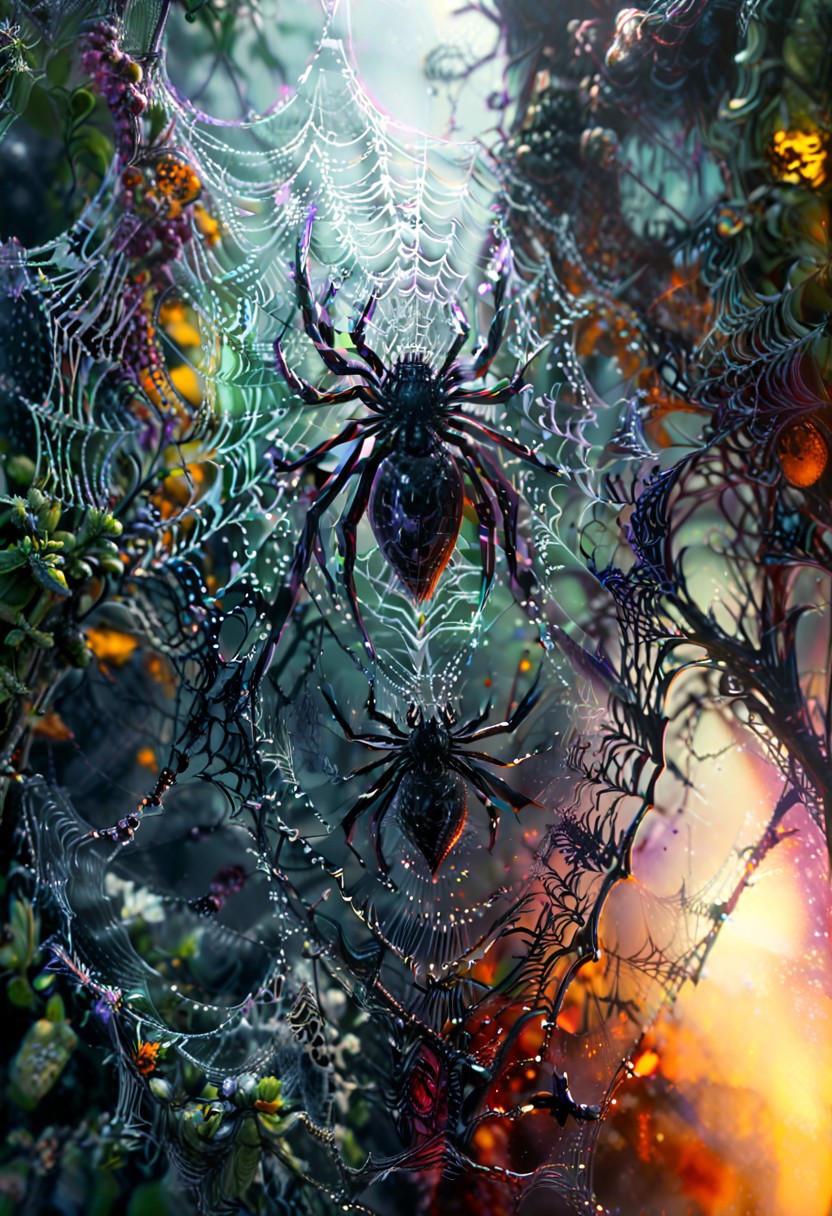 intricate, (cobweb and spider:1.7), lattice structure, creative, beautiful, vibrant, masterpiece, 8k, Ultra HD, amazing details, amazing quality, amazing artist, sharp edges, detailed textures, full view, atmospheric lighting, amazing visuals, detailxl, <lora:loraeyesxl:0.45>, <lora:WildcardX-XL-Detail-Enhancer:1.0>, <lora:xl_more_art-full_v1:0.40>