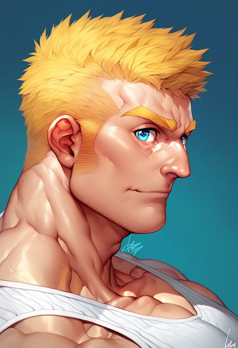 score_9,score_8_up,score_7_up, detailed face, detailed body, detailed eyes, Highest Quality, 4k, masterpiece, Amazing Details, (((portrait, GomTang, side view))), ((solo, 1boy, bara, calm face, short blonde hair, mutton sideburn, yellow eyebrows, blue eyes, tank top)), (in a gym),