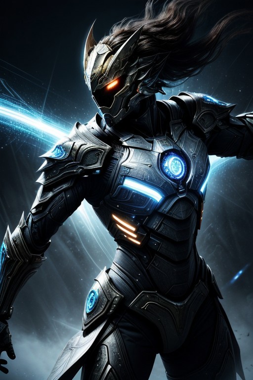 masterpiece, best quality, absurdres, illustration, photorealistic, cinematic lighting, dynamic angle, perfect composition, 1other, futuristic, oni, quantum particles, glowing fractals, futuristic armor, digital energy, multi-dimensional design, high-tech background