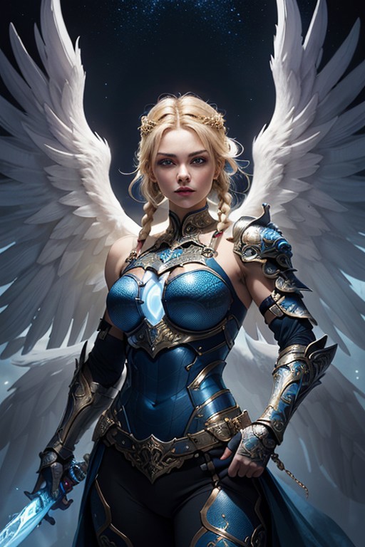middle-aged female angel knight , masterpiece, ASCII, 8k.absurdes, intricate, maximum resolution, Mirage, pureerosface_v1, DonMn1ghtm4reXL, glow, fog, heaven themed, heavenly background, ((huge angel wings spread wide)), ((blue accents on armor)), hyper-detailed armor, very intricate design, ((holding a glowing blue sword with gold filigree in her hands)), Blonde hair tied in a single braid, single braid in front, large build, wide shoulders, muscular, dynamic pose, ultra high resolution, perfect eyes, Chin held up high,