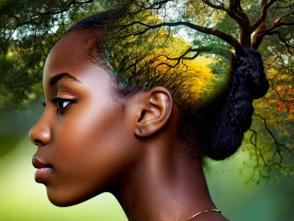 free flowing, high definition, color theory, stunning, sharp focus, close up of head, side portrait of a black girl, double exposure, trees, amora-style <lora:antonio-mora-style:1>