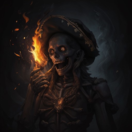 A Skeleton pirate with glowing eyes wearing a captains hat, mouth open screaming, surrounded by smoke and fire. A portrait in the style of fantasy art with cinematic lighting and blue tones. Volumetric light on a dark background, masterpiece, best quality, highly detailed, sharp focus, dynamic lighting, evang