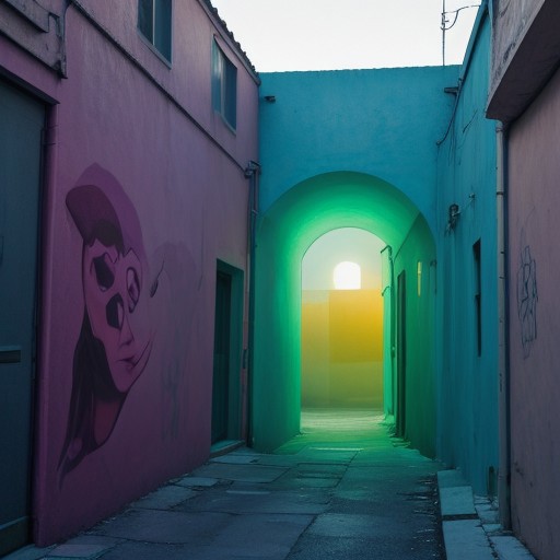 Un callejón urbano lleno de grafitis coloridos y arte callejero. Las paredes de ladrillo están cubiertas con murales vibrantes y expresivos que representan diferentes estilos y temas. La luz suave del atardecer ilumina el callejón, creando sombras interesantes y resaltando los colores brillantes del arte.
