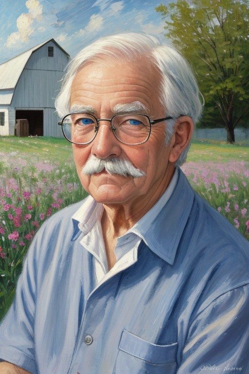 (old farmer man :1.2), sitting on top of a stone in front of a white barn, Impressionism ,oil painting with brushstrokes, 1 man, blue eyes, glasses, short silver hair, (silver mustache:1.1), looking at viewer, nose, solo, upper body, flower field, <lora:bichu-v0612:0.2>