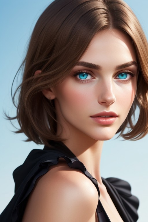 Generate a close-up headshot photo of a supermodel with light brown hair styled elegantly, light turquoise eyes that are upturned and protruding slightly, very sharp facial features emphasizing prominent high cheekbones and a long, slender nose. The model should have full, plump lips, perfectly styled eyebrows, and tanned white skin. Ensure the image highlights a sharp jawline, capturing the essence of high fashion and refined beauty