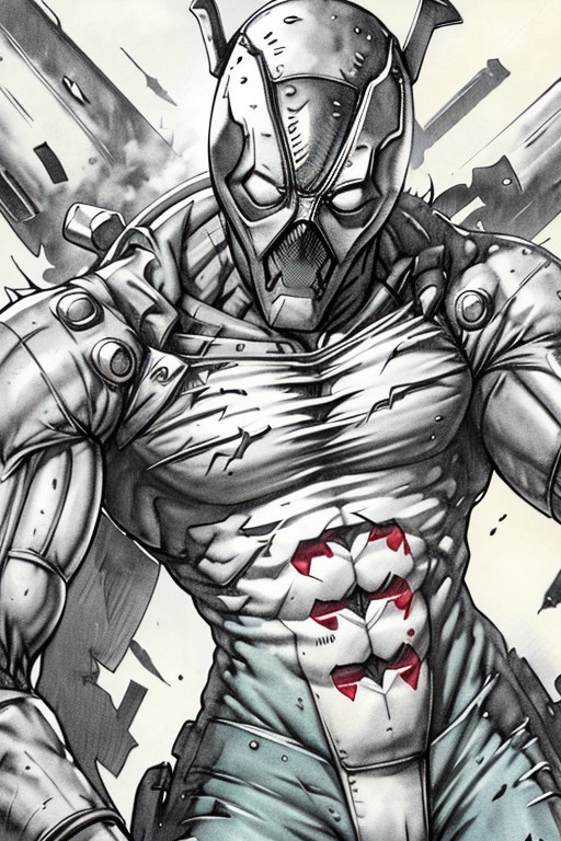 evang style, evang, Creature concept art, deadpool in a torn spacesuit, Damaged ripped, pockets, pouches, solo, dutch angle, (close up:1.2), portrait,, smirk, skinny, pov, leaning toward viewer, realistic