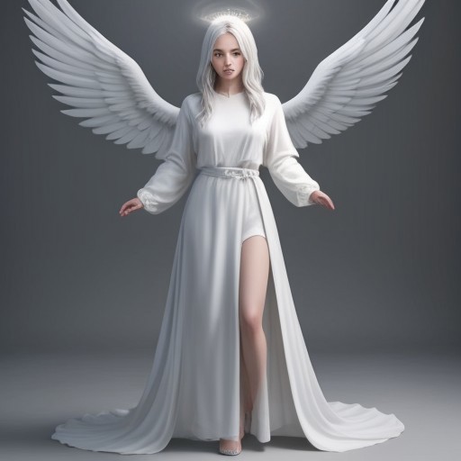 Long Sleeved Angel, Long White Hair, Femboy, 1girl, long white dress, long big hair, Silver Hair, epic hair, angel wings, heaven background, white theme, white skin, holy light, angel halo, Full Body
