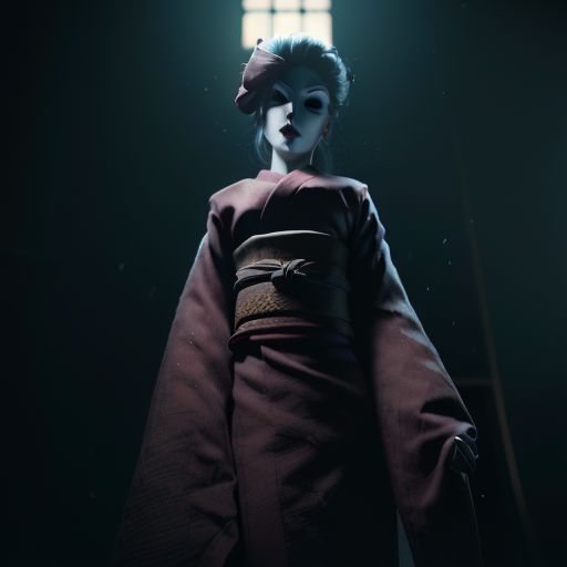 high res, good quality, accurate face, ((high resolution:1.2), (hi-res:1.2), masterpiece, best quality), easynegative, ng_deepnegative_v1_75t, bad-picture-chill-75v, The Lady, video game character, Little Nightmares, Red kimono , porcelain mask , Taller woman, in a dark room,
