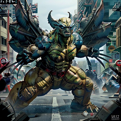 Wolverine, Godzilla, Ghidorah, fighting in the streets of New York, 1930s, score_9, score_8_up, score_7_up, score_7, score_6_up, 1man, wolverine costume, 3 claws, Marvel's Sentinel,