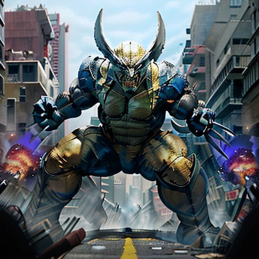 Wolverine fights a godzilla in the streets of New York 2999, score_9, score_8_up, score_7_up, score_7, score_6_up, 1man, wolverine costume, 3 claws, Marvel's Sentinel,