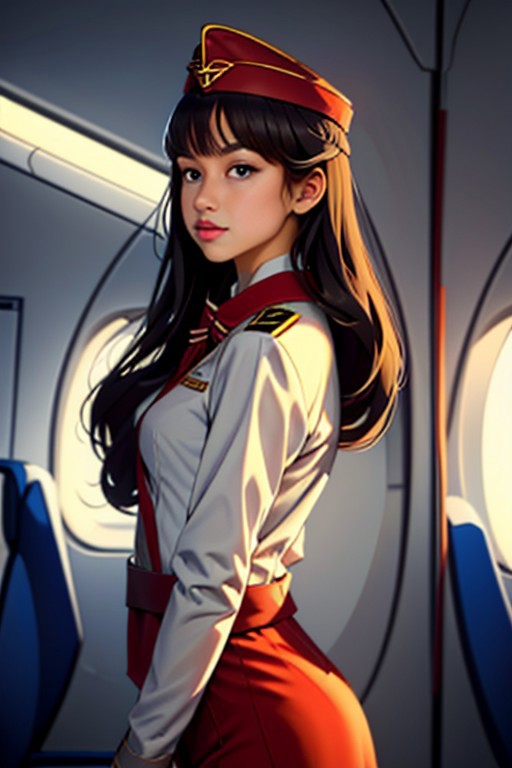 sketch, 1girl, bangs, red uniform, pencil skirt, upper body, Stewardess, garrison cap, pantyhose, bend over, from side, looking at viewer, upper body, cleavage