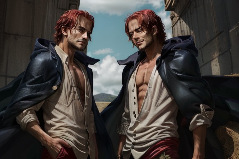 (masterpiece, best quality), intricate details, 2mans, twins, red hair, straw hat, <lora:Shanks:0.8> Shnks, shanks \(one piece\), scar on face, short hair, shirt, white shirt, open clothes, collared shirt, pants, cape, coat, open shirt, facial hair, scar, sandals, pectorals, partially unbuttoned, pectoral cleavage, coat on shoulders, upper body, straw hat, standing on right side Shnks, shanks \(one piece\), short hair, shirt, white shirt, open clothes, collared shirt, pants, hood, cape, coat, open shirt, facial hair, sandals, pectorals, partially unbuttoned, pectoral cleavage, upper body, standing on left side BREAK stand face to face, looking at each other with competitive expressions. their faces showing seriousness and focus