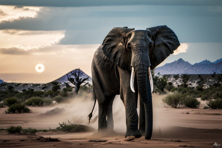 Desert landscape (masterpiece, best quality: 1.5), ultra detailed, a male elephant (front view), lots of dust, charging the cameraman, (realistic: 1.5), photography, epic in black and white, art by , artgerm, in the style of , Artstation Deviant Art, strobe moonlight twilight rays, dark and complex image, highly detailed post-processing, trending on artstation Octane, cinematic fine details, intricate decor